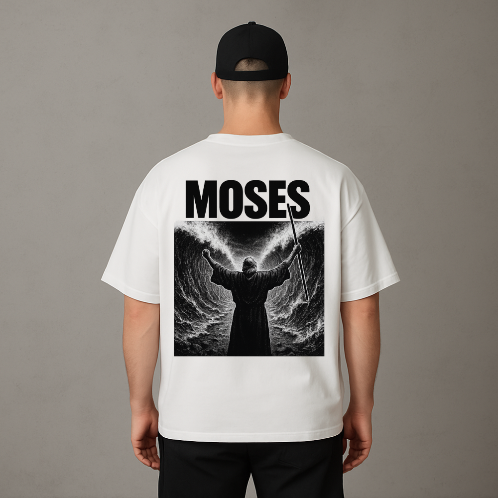 Inspired by Exodus 14, this tee captures Moses in the moment — staff raised, waters split, fear behind, freedom ahead. A reminder that God makes a way where there is none. Made for those who walk forward when the world says stop.
